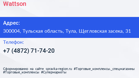 Wattson по адресу 300004, Тульская область, Тула, Щегловская засека, 31 в дальнейшем Организация, размещена в следующих категориях: