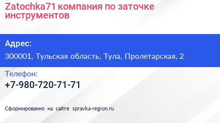 Zatochka71, компания по заточке инструментов по адресу 300001, Тульская область, Тула, Пролетарская, 2 в дальнейшем Организация, размещена в следующих категориях: