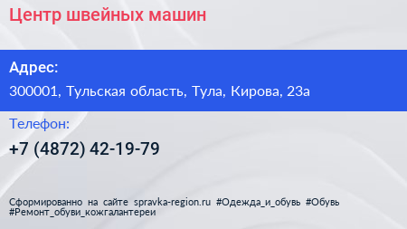 Центр швейных машин по адресу 300001, Тульская область, Тула, Кирова, 23а в дальнейшем Организация, размещена в следующих категориях: