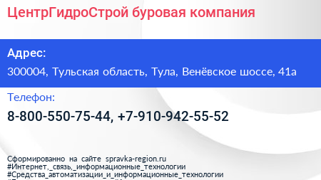 ЦентрГидроСтрой, буровая компания по адресу 300004, Тульская область, Тула, Венёвское шоссе, 41а в дальнейшем Организация, размещена в следующих категориях: