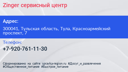 Zinger, сервисный центр по адресу 300041, Тульская область, Тула, Красноармейский проспект, 7 в дальнейшем Организация, размещена в следующих категориях: