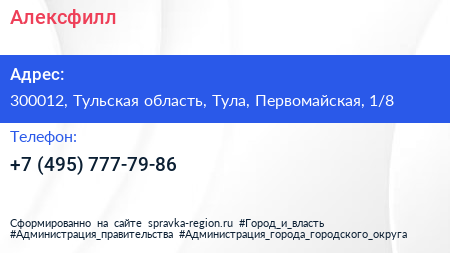 Алексфилл по адресу 300012, Тульская область, Тула, Первомайская, 1/8 в дальнейшем Организация, размещена в следующих категориях: