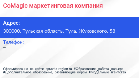 CoMagic, маркетинговая компания по адресу 300000, Тульская область, Тула, Жуковского, 58 в дальнейшем Организация, размещена в следующих категориях: