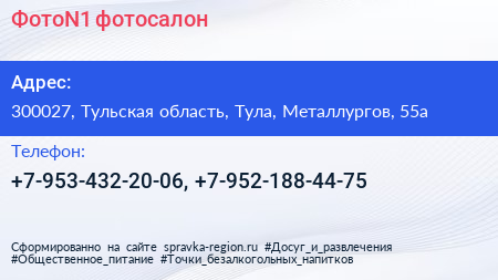 ФотоN1, фотосалон по адресу 300027, Тульская область, Тула, Металлургов, 55а в дальнейшем Организация, размещена в следующих категориях: