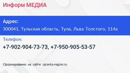 Информ-МЕДИА по адресу 300041, Тульская область, Тула, Льва Толстого, 114а в дальнейшем Организация, размещена в следующих категориях: