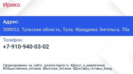 Ирико по адресу 300012, Тульская область, Тула, Фридриха Энгельса, 70а в дальнейшем Организация, размещена в следующих категориях: