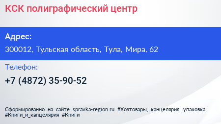 КСК, полиграфический центр по адресу 300012, Тульская область, Тула, Мира, 62 в дальнейшем Организация, размещена в следующих категориях:
