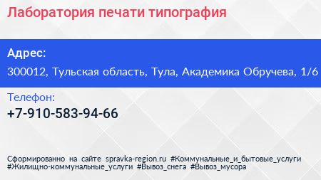 Лаборатория печати, типография по адресу 300012, Тульская область, Тула, Академика Обручева, 1/6 в дальнейшем Организация, размещена в следующих категориях: