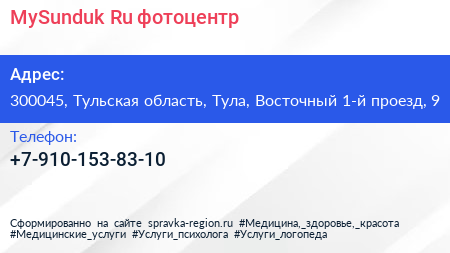 MySunduk.Ru, фотоцентр по адресу 300045, Тульская область, Тула, Восточный 1-й проезд, 9 в дальнейшем Организация, размещена в следующих категориях: