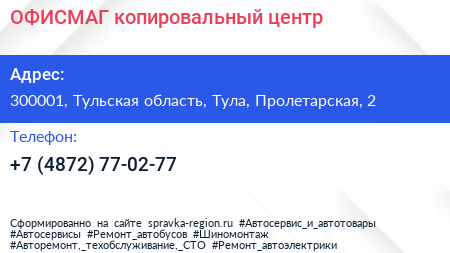 ОФИСМАГ, копировальный центр по адресу 300001, Тульская область, Тула, Пролетарская, 2 в дальнейшем Организация, размещена в следующих категориях: