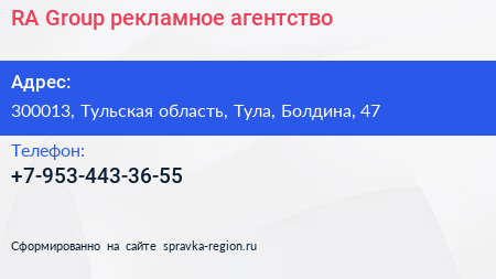 RA Group, рекламное агентство по адресу 300013, Тульская область, Тула, Болдина, 47 в дальнейшем Организация, размещена в следующих категориях: