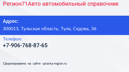 Регион71Авто, автомобильный справочник по адресу 300013, Тульская область, Тула, Седова, 36 в дальнейшем Организация, размещена в следующих категориях: