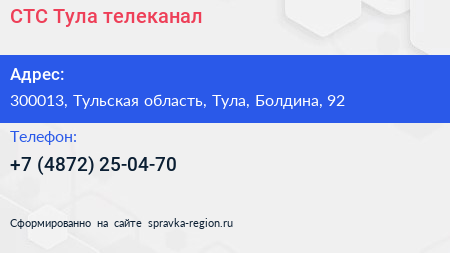 СТС Тула, телеканал по адресу 300013, Тульская область, Тула, Болдина, 92 в дальнейшем Организация, размещена в следующих категориях: