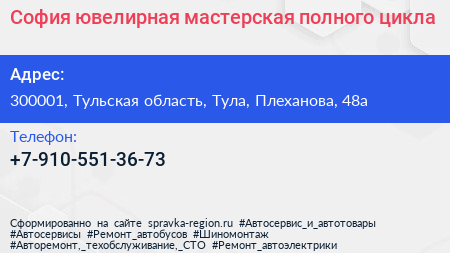 София, ювелирная мастерская полного цикла по адресу 300001, Тульская область, Тула, Плеханова, 48а в дальнейшем Организация, размещена в следующих категориях: