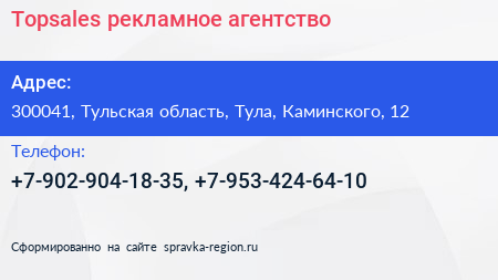 Topsales, рекламное агентство по адресу 300041, Тульская область, Тула, Каминского, 12 в дальнейшем Организация, размещена в следующих категориях: