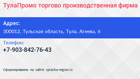ТулаПромо, торгово-производственная фирма по адресу 300012, Тульская область, Тула, Агеева, 6 в дальнейшем Организация, размещена в следующих категориях: