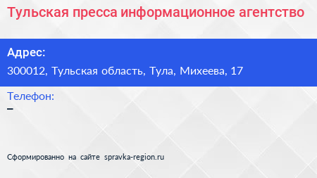 Тульская пресса, информационное агентство по адресу 300012, Тульская область, Тула, Михеева, 17 в дальнейшем Организация, размещена в следующих категориях:
