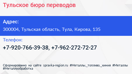 Тульское бюро переводов по адресу 300004, Тульская область, Тула, Кирова, 135 в дальнейшем Организация, размещена в следующих категориях: