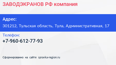 ЗАВОДЭКРАНОВ.РФ, компания по адресу 301212, Тульская область, Тула, Административная, 17 в дальнейшем Организация, размещена в следующих категориях: