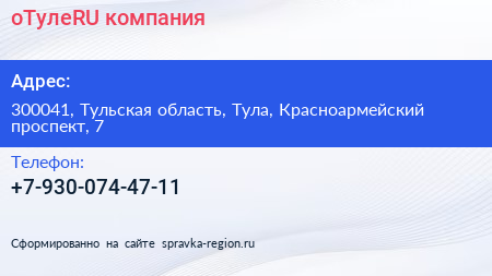 оТулеRU, компания по адресу 300041, Тульская область, Тула, Красноармейский проспект, 7 в дальнейшем Организация, размещена в следующих категориях: