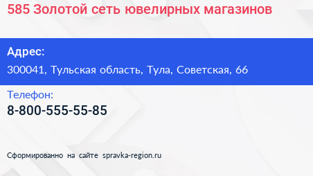 585 Золотой, сеть ювелирных магазинов по адресу 300041, Тульская область, Тула, Советская, 66 в дальнейшем Организация, размещена в следующих категориях: