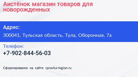 Аистёнок, магазин товаров для новорожденных по адресу 300041, Тульская область, Тула, Оборонная, 7а в дальнейшем Организация, размещена в следующих категориях: