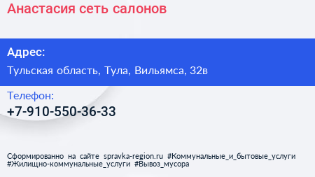 Анастасия, сеть салонов по адресу Тульская область, Тула, Вильямса, 32в в дальнейшем Организация, размещена в следующих категориях: