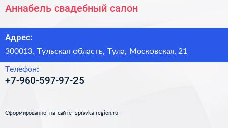 Аннабель, свадебный салон по адресу 300013, Тульская область, Тула, Московская, 21 в дальнейшем Организация, размещена в следующих категориях: