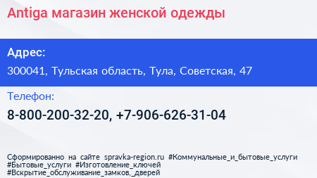 Antiga, магазин женской одежды по адресу 300041, Тульская область, Тула, Советская, 47 в дальнейшем Организация, размещена в следующих категориях: