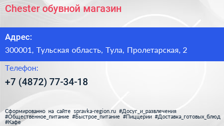 Chester, обувной магазин по адресу 300001, Тульская область, Тула, Пролетарская, 2 в дальнейшем Организация, размещена в следующих категориях: