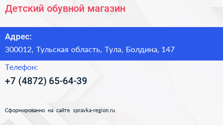 Детский обувной, магазин по адресу 300012, Тульская область, Тула, Болдина, 147 в дальнейшем Организация, размещена в следующих категориях:
