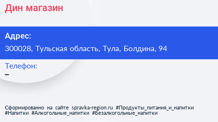 Дин, магазин по адресу 300028, Тульская область, Тула, Болдина, 94 в дальнейшем Организация, размещена в следующих категориях: