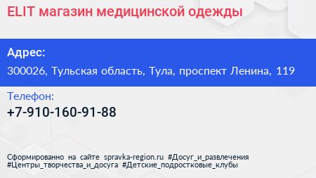 ELIT, магазин медицинской одежды по адресу 300026, Тульская область, Тула, проспект Ленина, 119 в дальнейшем Организация, размещена в следующих категориях: