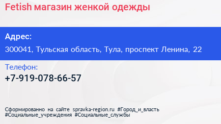 Fetish, магазин женкой одежды по адресу 300041, Тульская область, Тула, проспект Ленина, 22 в дальнейшем Организация, размещена в следующих категориях: