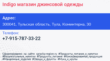 Indigo, магазин джинсовой одежды по адресу 300041, Тульская область, Тула, Коминтерна, 30 в дальнейшем Организация, размещена в следующих категориях: