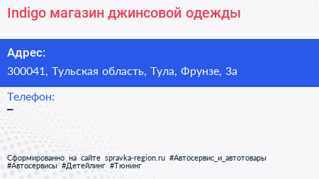 Indigo, магазин джинсовой одежды по адресу 300041, Тульская область, Тула, Фрунзе, 3а в дальнейшем Организация, размещена в следующих категориях: