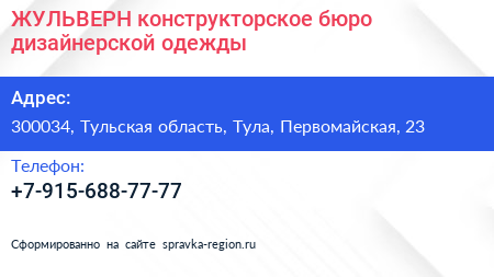ЖУЛЬВЕРН, конструкторское бюро дизайнерской одежды по адресу 300034, Тульская область, Тула, Первомайская, 23 в дальнейшем Организация, размещена в следующих категориях: