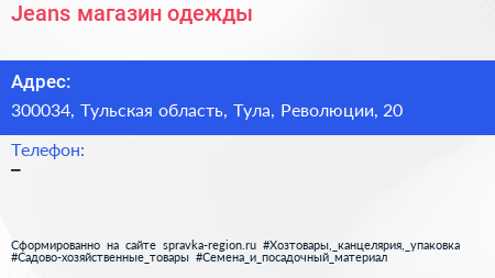 Jeans, магазин одежды по адресу 300034, Тульская область, Тула, Революции, 20 в дальнейшем Организация, размещена в следующих категориях: