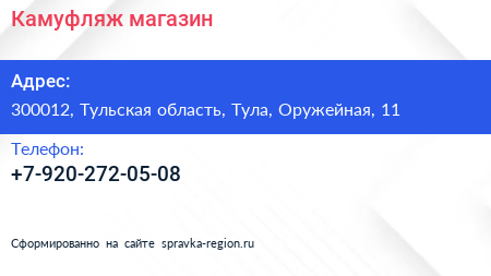 Камуфляж, магазин по адресу 300012, Тульская область, Тула, Оружейная, 11 в дальнейшем Организация, размещена в следующих категориях: