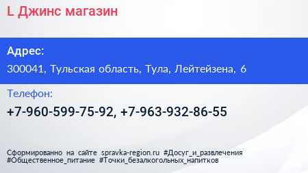 L-Джинс, магазин по адресу 300041, Тульская область, Тула, Лейтейзена, 6 в дальнейшем Организация, размещена в следующих категориях: