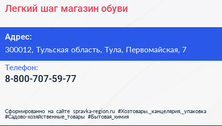 Легкий шаг, магазин обуви по адресу 300012, Тульская область, Тула, Первомайская, 7 в дальнейшем Организация, размещена в следующих категориях: