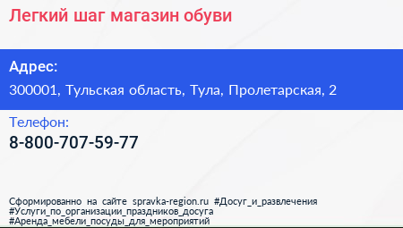 Легкий шаг, магазин обуви по адресу 300001, Тульская область, Тула, Пролетарская, 2 в дальнейшем Организация, размещена в следующих категориях: