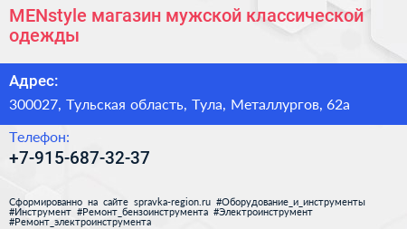 MENstyle, магазин мужской классической одежды по адресу 300027, Тульская область, Тула, Металлургов, 62а в дальнейшем Организация, размещена в следующих категориях: