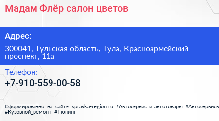 Мадам Флёр, салон цветов по адресу 300041, Тульская область, Тула, Красноармейский проспект, 11а в дальнейшем Организация, размещена в следующих категориях: