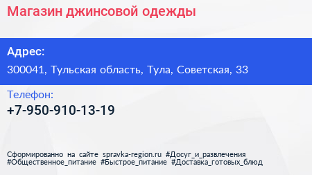 Магазин джинсовой одежды по адресу 300041, Тульская область, Тула, Советская, 33 в дальнейшем Организация, размещена в следующих категориях: