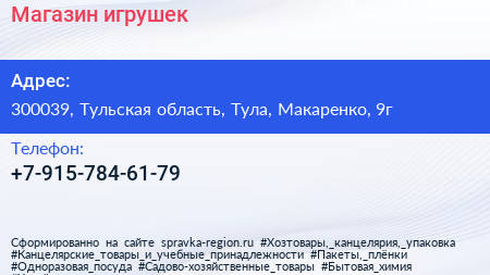 Магазин игрушек по адресу 300039, Тульская область, Тула, Макаренко, 9г в дальнейшем Организация, размещена в следующих категориях: