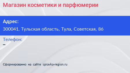 Магазин косметики и парфюмерии по адресу 300041, Тульская область, Тула, Советская, 86 в дальнейшем Организация, размещена в следующих категориях: