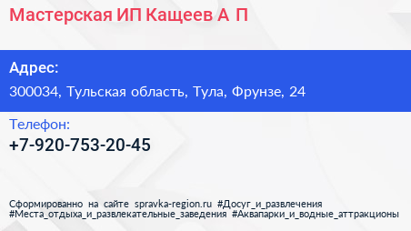 Мастерская, ИП Кащеев А.П. по адресу 300034, Тульская область, Тула, Фрунзе, 24 в дальнейшем Организация, размещена в следующих категориях: