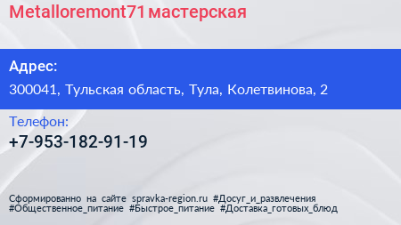 Metalloremont71, мастерская по адресу 300041, Тульская область, Тула, Колетвинова, 2 в дальнейшем Организация, размещена в следующих категориях:
