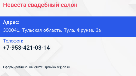 Невеста, свадебный салон по адресу 300041, Тульская область, Тула, Фрунзе, 3а в дальнейшем Организация, размещена в следующих категориях: